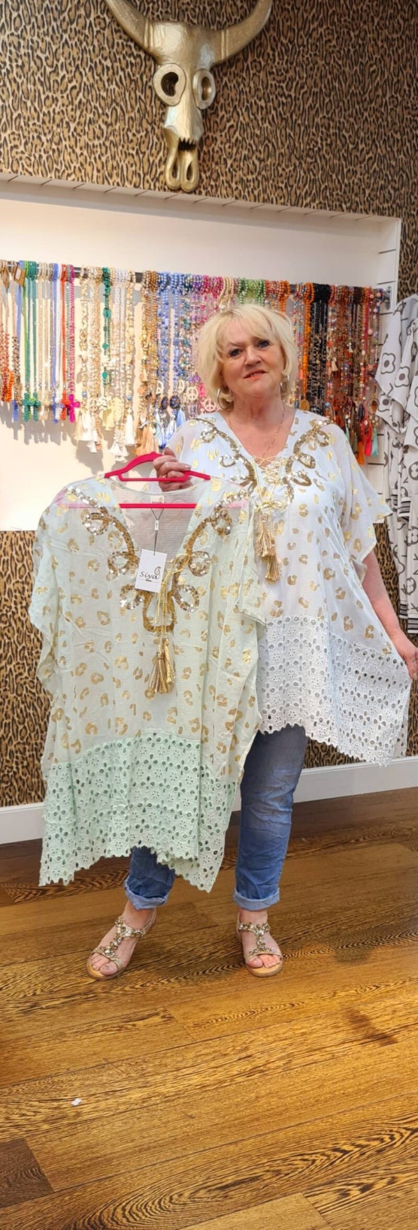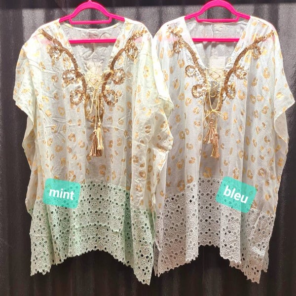 Kaftan katoen Afgezet met goud panter en rand broderie en bij de v hals Afgezet met gouden pailletten applicaties