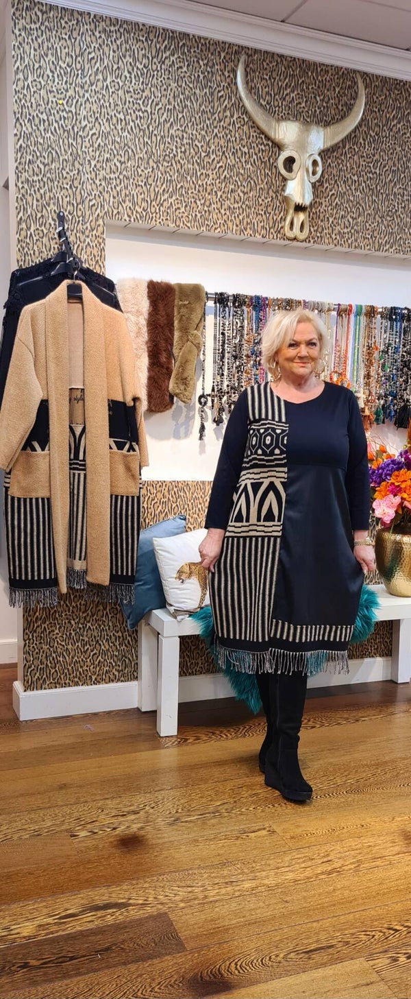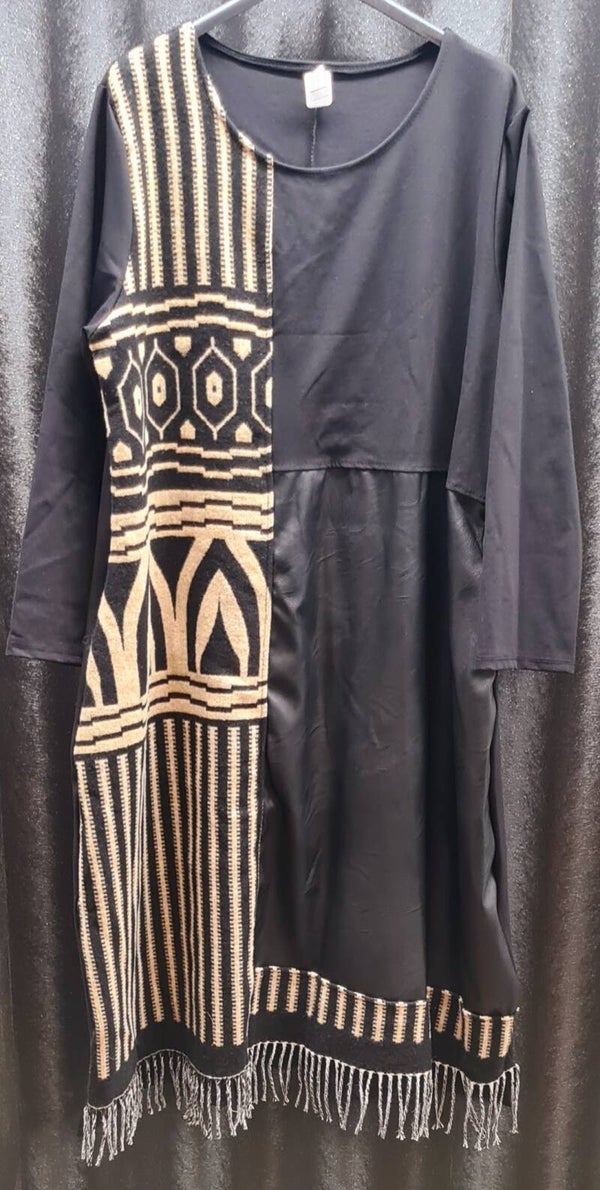 Prachtige exclusieve jurk afgezet met franje Mooie stof en leatherlook