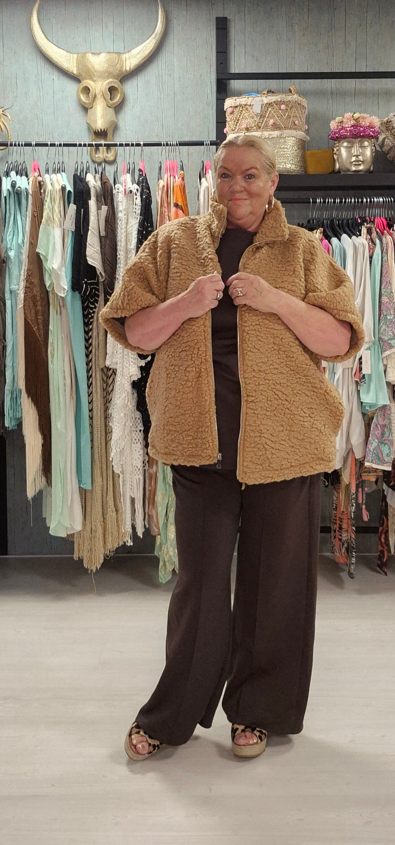 Prachtige teddy bodywarmer met rits en zakken in supermooie najaars kleuren