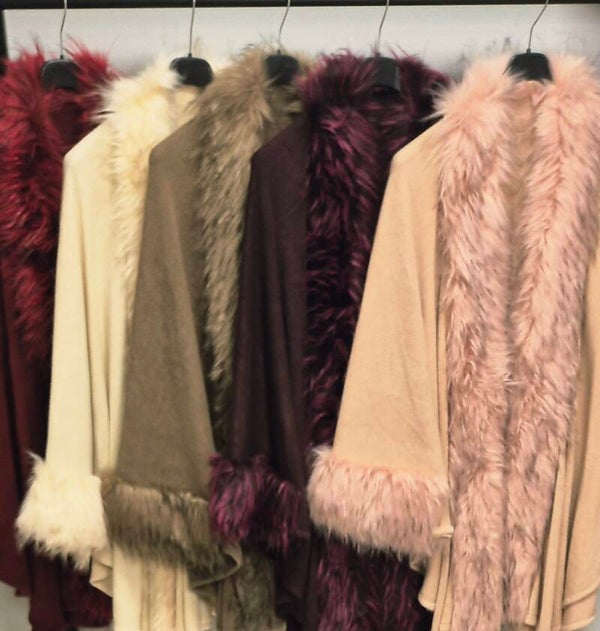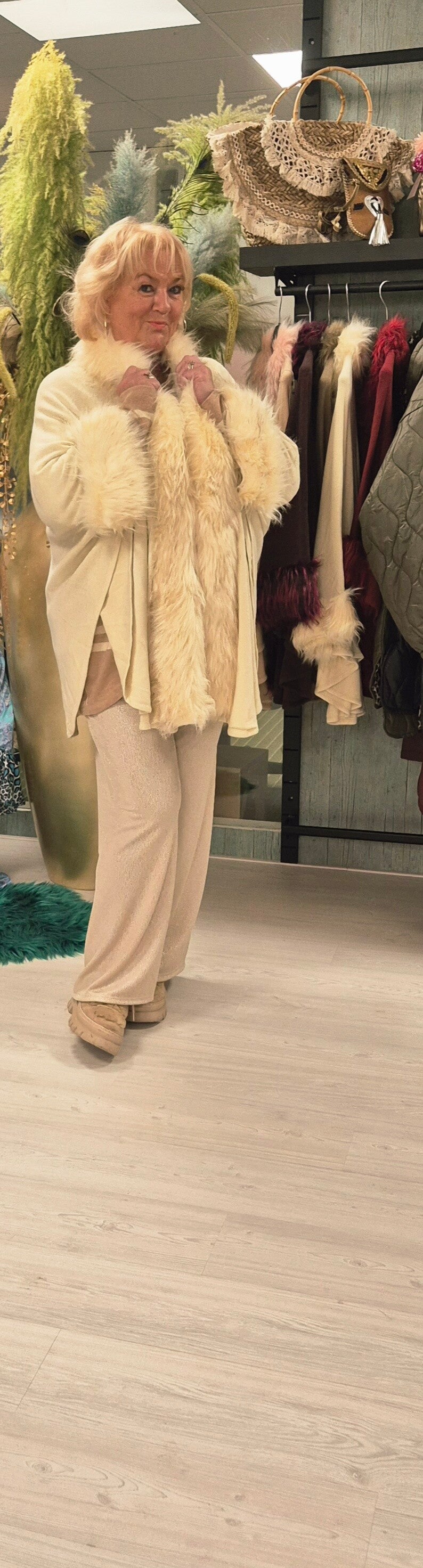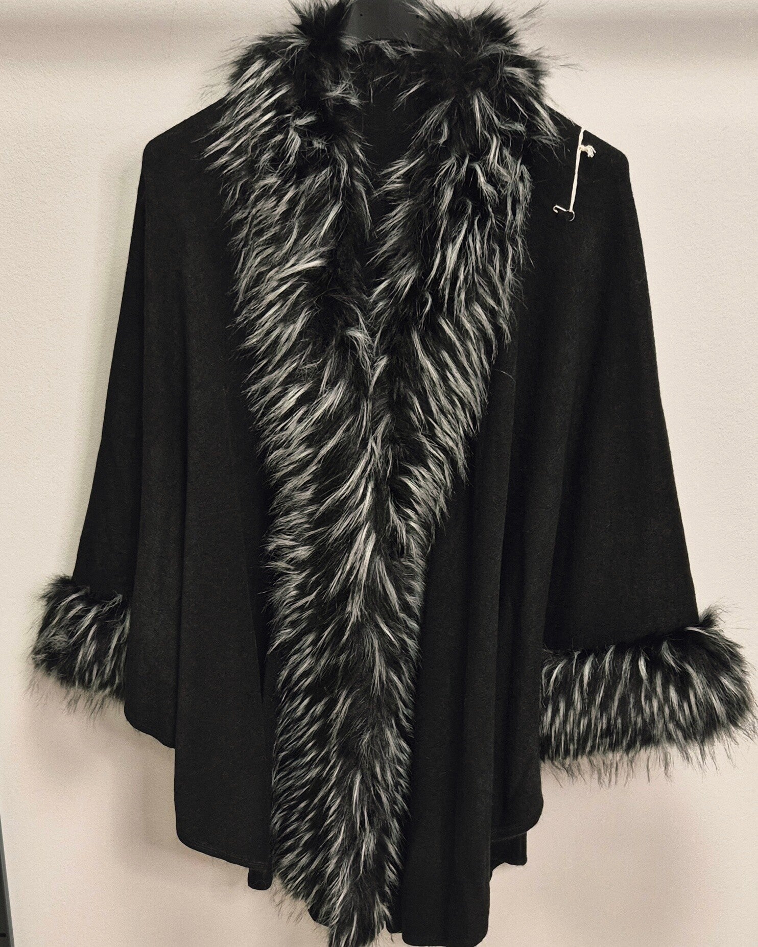 Prachtige omslagdoek/vest met fake fur kraag en aan de pols prachtig fake fur bont