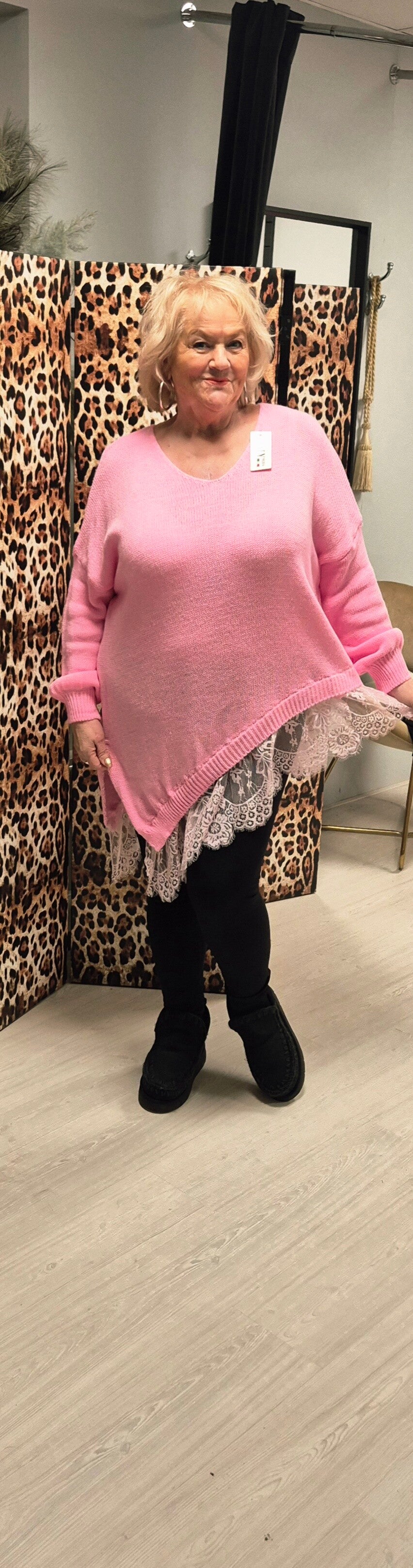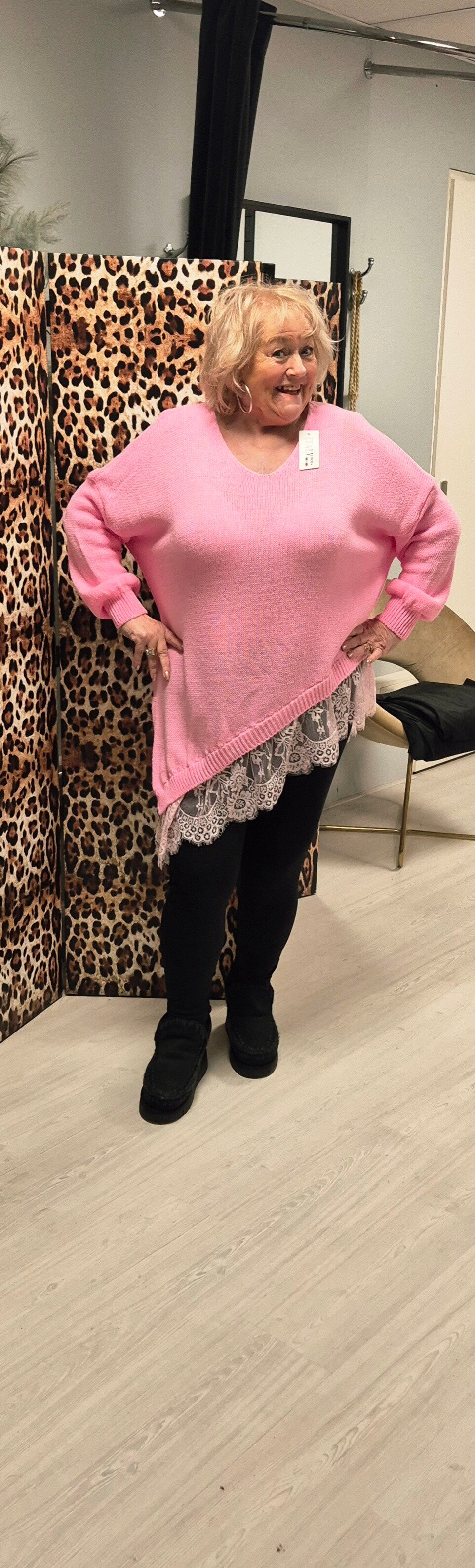 Prachtige heerlijke aparte trui symmetrisch afgewerkt met prachtig Italiaans kant